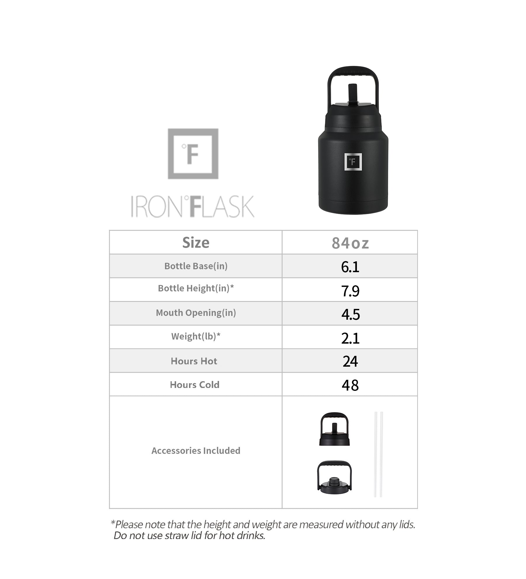 Why gulp when you can sip? With the Iron Flask 84 oz Wide Mouth Water Bottle With Straw Lid. you can drink your favorite beverage without expending any of the energy required to unscrew lids or tilt your chin. and in case you feel like drinking differently. we’ve included a flip lid and a stainless steel screw-on lid. This 14 oz bottle is powder coated in a variety of colors and vacuum-sealed to keep your favorite beverages cold for 24 hours and hot for 12 hours.
